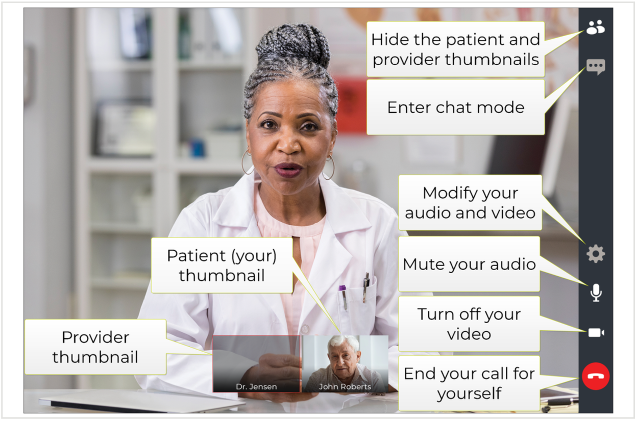 The window is divided into a main view of your provider in the center, thumbnails of participants, and a menu bar to manage the virtual visit. For example, you can click the